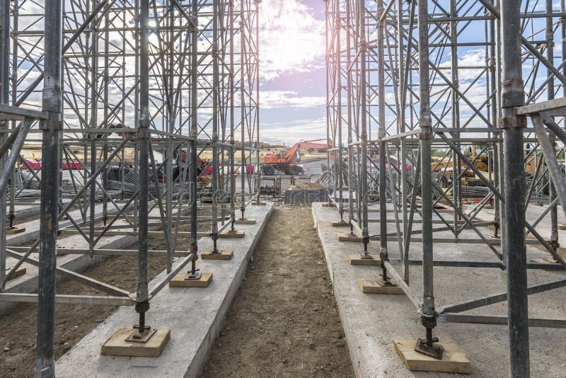 Scaffolding Metal Structure For The Construction Of A Bridge On A Road Stock Photo Image Of Activity Scaffolding 181100684